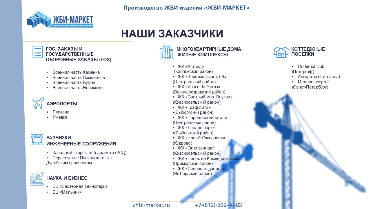 У нас есть 8 крупных складов в Ленинградской области, 3 собственные производственные площадки и 7 заводов-партнеров. Благодаря этому мы можем предложить нашим клиентам широкий выбор качественных железобетонных изделий по низким ценам, которые всегда в наличии на наших складах.